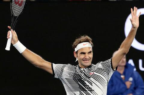 Switzerland's Roger Federer celebrates after defeating Germany's Mischa Zverev during their quarterfinal at the Australian Open tennis championships in Melbourne, Australia, Tuesday, Jan. 24, 2017. (AP Photo/Aaron Favila)