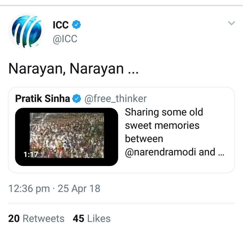 ICC actually retweeted a post by Alt news journalist Pratik Sinha with the caption ‘Narayan Narayan’.