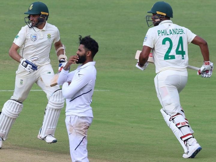Once again Keshav Maharaj and Vernon Philander have come in South Africa’s rescue as they still trail by 154 runs with just 3 wickets in hand. After India imposed the follow-on, the Proteus batting surrendered against the Indian attack as they lost 7 of their batsmen until tea break on the fourth day of the ongoing second Test in Pune. By the end of the second session, Vernon Philander (29) was batting along with Maharaj (17). The duo will resume the South African innings at 172/7. Ravindra Jadeja remained the wrecker-in-chief after the lunch break as he spun a web around the South Africa batters. Quinton de Kock (5) was the first to depart after the first session, trying to slog-sweep Jadeja and losing his stumps in the process. Ajinkya Rahane then pulled off a stunning catch to remove Bavuma (38) off Jadeja while Senuran Muthusamy (9) was removed by Mohammed Shami, Rohit Sharma taking a catch at second slip. Earlier, Ashwin took two wickets as India reduced South Africa to 74/4 at lunch. The session though belonged to India stumper Wriddhiman Saha's brilliance behind the stumps as the 34-year old took a stunning one-handed diving catch off Umesh Yadav's delivery to dismiss Theunis De Bruyn (8) in the sixth over of the innings. Saha's effort left all his teammates amused as skipper Virat Kohli came running to congratulate the diminutive wicketkeeper whom he hailed as the best in the world a few days back. The Proteas were eventually bowled out for 275, still, 326 runs behind India's mammoth first innings score of 601/5d. Brief scores: 1st innings: India 601/5d; South Africa 275; 2nd innings: 172/7 (Dean Elgar 48, Temba Bavuma 38; R Ashwin 2/45, Ravindra Jadeja 2/47)