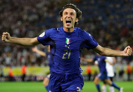 FILE - In this Tuesday, July 4, 2006 filer, Italy's Andrea Pirlo celebrates his side's first goal by teammate Fabio Grosso in the extra time of the semifinal World Cup soccer match between Germany and Italy in Dortmund, Germany. Tributes poured in for Andrea Pirlo after Italy's midfield maestro retired. The 38-year-old passing wizard played his final match on Sunday when New York City FC was beaten 4-3 by the Columbus Crew in the MLS Eastern Conference finals. Pirlo came on in the 90th minute of the match and was greeted with a showering of affection from fans at Yankee Stadium. While Pirlo played his final seasons in the United States, he made his name by helping AC Milan and Juventus win a combined six Serie A titles, two Champions Leagues with Milan and the above all the 2006 World Cup with Italy. (AP Photo/Andrew Medichini, File)