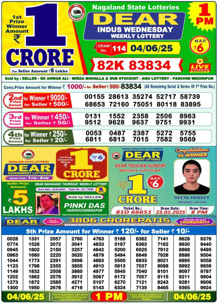 Nagaland Lottery Sambad WEDNESDAY Result (June 04, 2025): Dear INDUS 1 PM Draw Declared - 1st Prize Ticket No. 82K 83834