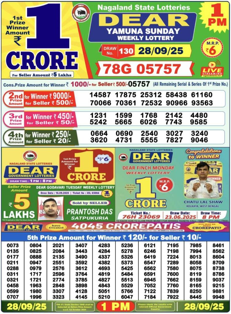 Nagaland Lottery Sambad SUNDAY (28.09.2025): Dear YAMUNA MORNING 1 PM Draw DECLARED - 1st Prize Ticket No. 78G 05757