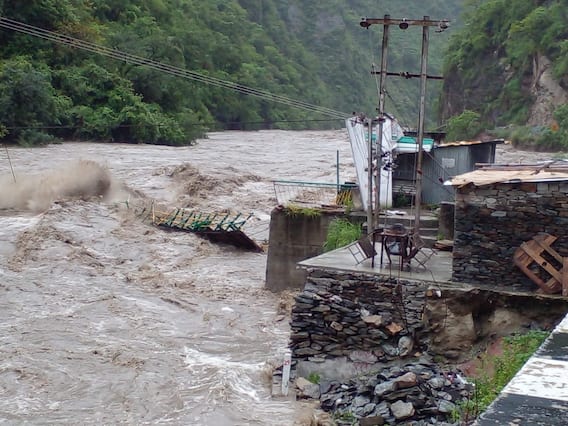 New Delhi: Amid heavy rainfall in the hill state of Himachal Pradesh, water from overflowing Beas river has entered the Pandoh village in Mandi district, washing away a bridge connecting Aut village to Banjar, reported ANI.
