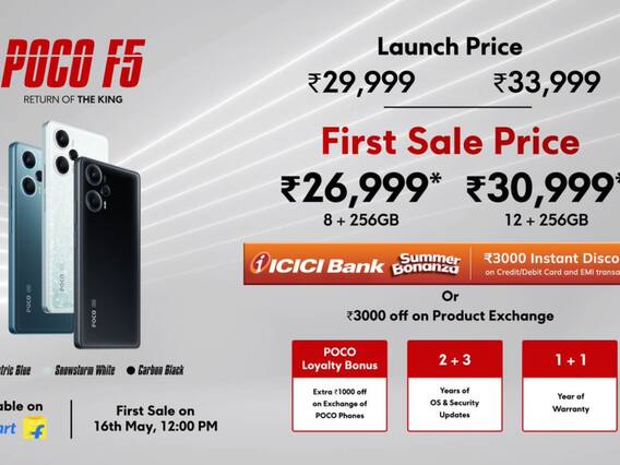 The Poco F5 5G is also available in another storage model for Rs 33,999 for 12GB RAM/256GB storage. There is an introductory offer under which the base model will be available for Rs 26,999 while the 12GB RAM model will be available for Rs 30,999. The Poco F5 5G comes with a one-year warranty in the country. The device will go on sale on e-commerce site Flipkart on May 16 in three colours: Carbon Black, Electric Blue and Snowstorm White.