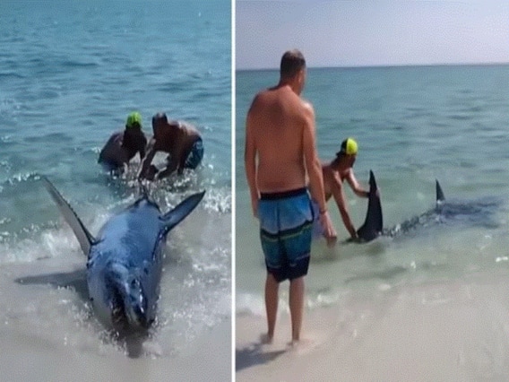A video of some beachgoers rescuing a giant Mako shark stranded on the sand in Florida, USA has gone viral on the internet. In the clip a group of people on the Pensacola Beach can be seen wrestling the shark back into the water, and after several attempts, manage to push it back into the sea. The video was captured by Tina Fey, who was on a vacation in the area with her husband. The couple was hanging out on the beach when they spotted the Mako shark.