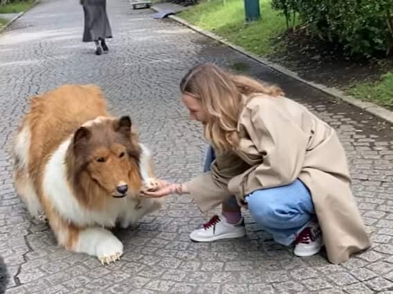 In the video, Toco, appearing to be of the Collie breed, is seen being taken out for a walk with a leash around the neck. The human-dog sniffs other dogs in the park and rolls around on the floor just like animals do.