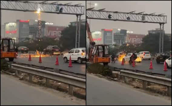 According to the video, the scene was captured on National Highway 8 in Gurugram. Some vehicles were passing under the sparks, some were trying to go around, and others were waiting for the welding to finish so they could safely move on.
