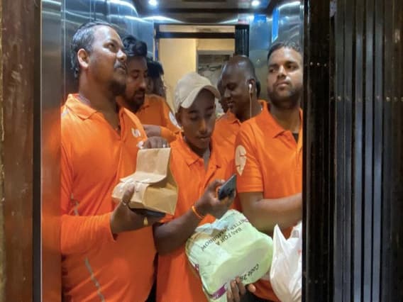 In the viral picture one can see five Swiggy delivery executives in an elevator, each holding a food packet. The Twitter user happened to witness the scene and captured it in his camera.