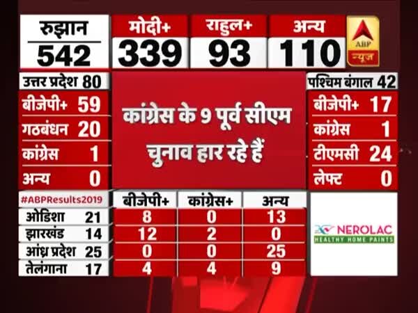 Riding on a massive Modi wave sweeping through most parts of India, the BJP was set to return to power while the Congress trailed far behind. According to trends released by ABP News on Thursday for all 542 seats that went to polls, the NDA is winning 332 seats, while Congress is leading 98 seats.