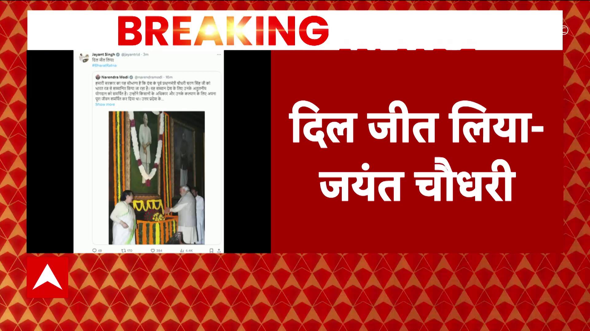 Jayant Chaudhary of RLD welcomed PM Modi's announcement of Bharat Ratna for Chaudhary Charan Singh. As soon as PM Modi tweeted regarding Chaudhary Charan Singh being awarded with Bharat Ratna award, the RLD leader retweeted PM Modi's post with the caption, 'Dil Jeet Liya'. These awards recognize their contributions to the country.