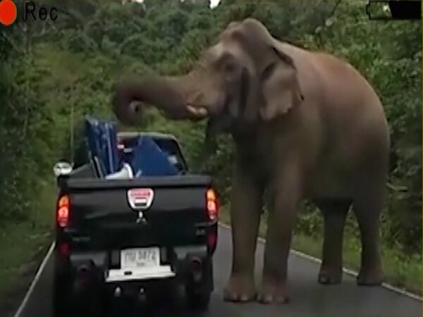 An elephant is seen searching a truck. The mammal take out all the bags and baskets from the truck and then moves away. The incident is of Thailand and the elephant was hungry