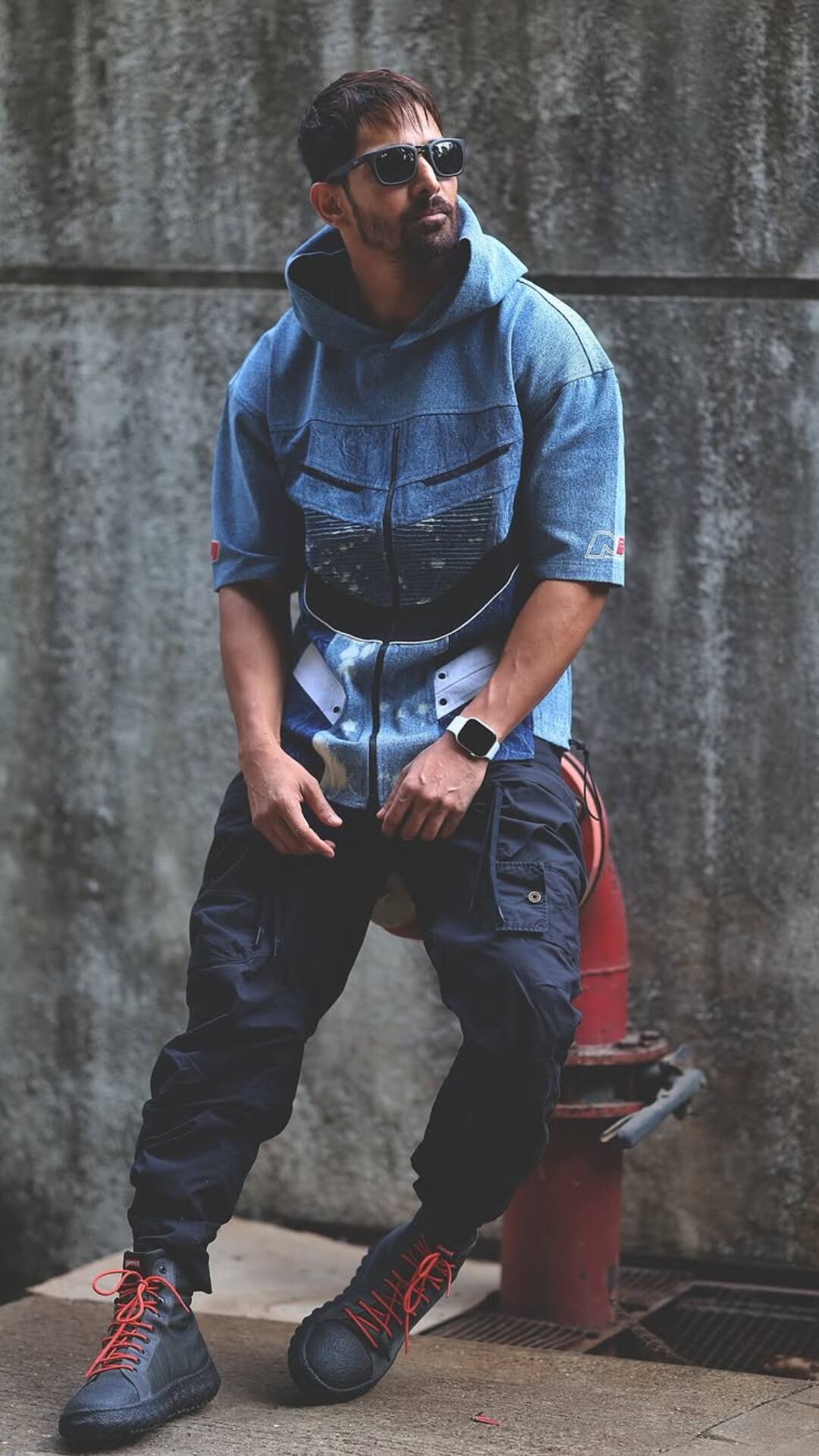 For that cool and comfy street-style look, wear the relaxed fit of a blue baggy hooded T-shirt along with black pants and finish with shades.